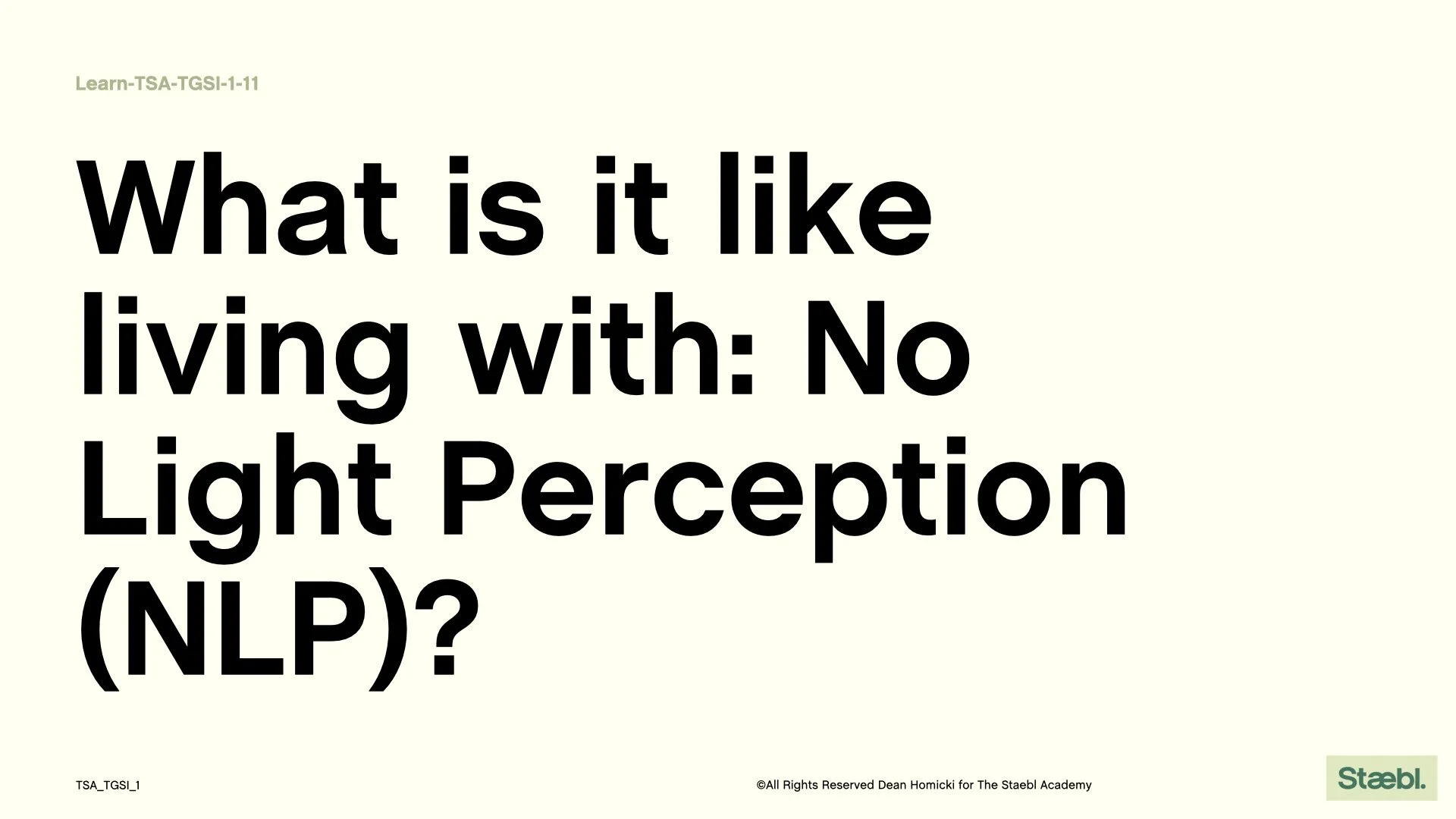 In this module, we explore what a vision-impaired person may experience living with No Light Perception (NLP) and how the built environment may appear to them in their daily life. To gain some insight, let's begin with: