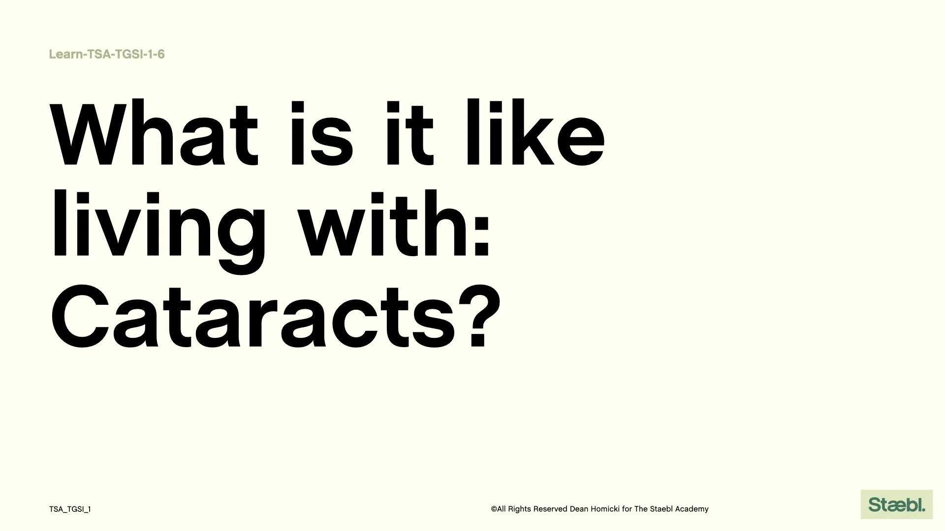 In this module, we explore what a vision-impaired person may experience living with Cataracts and how the built environment may appear to them in their daily life. To gain some insight, let's begin with: