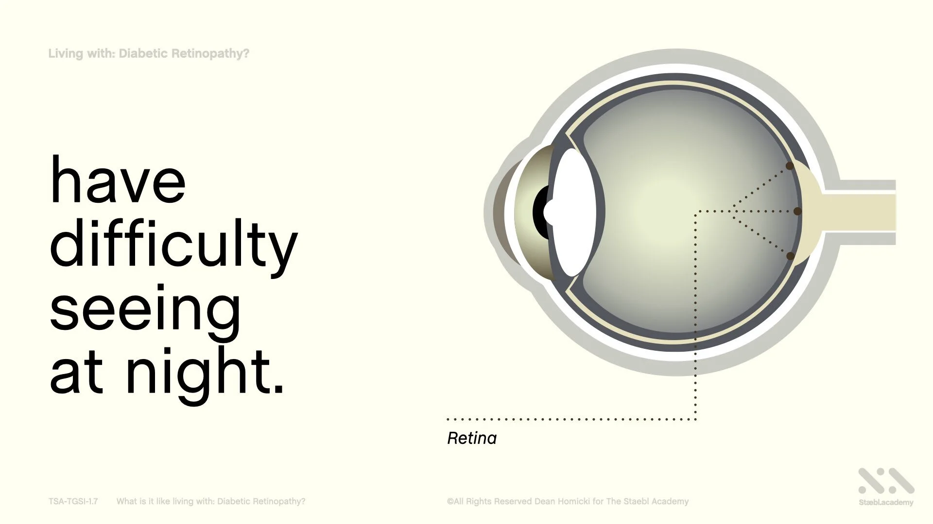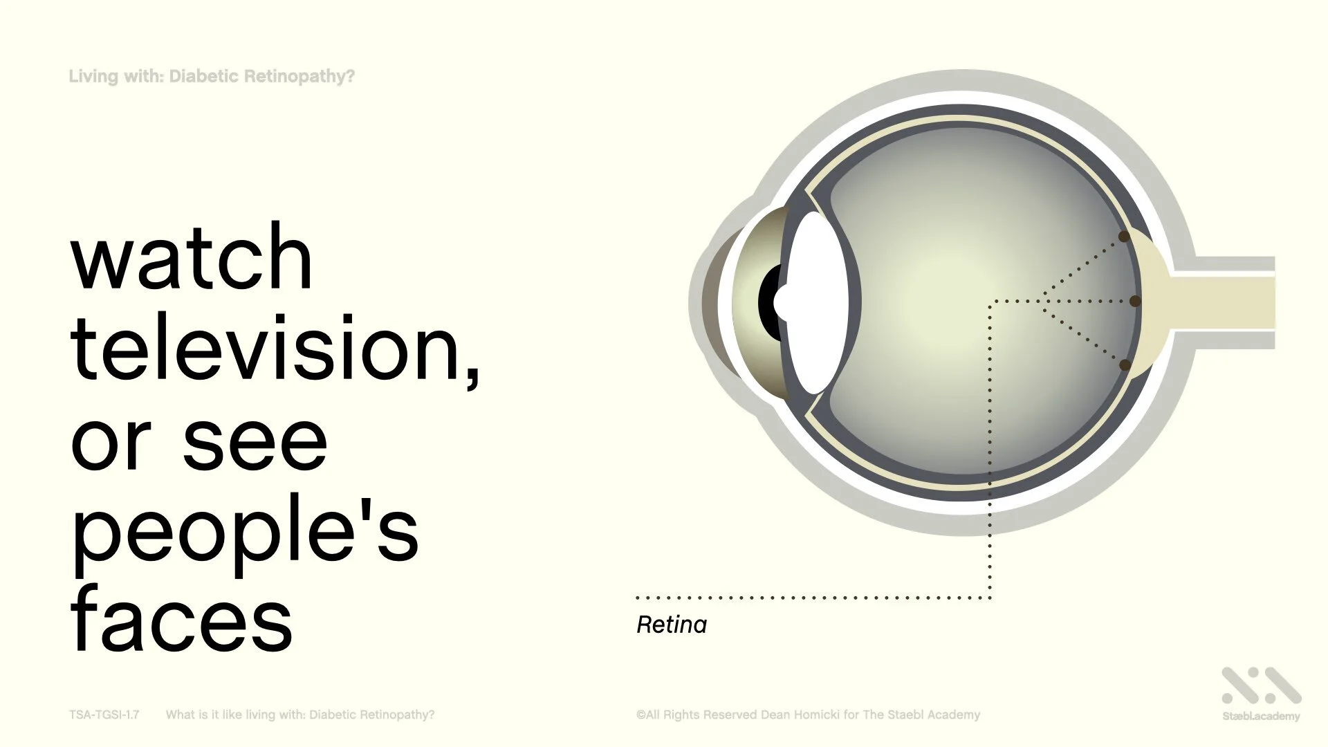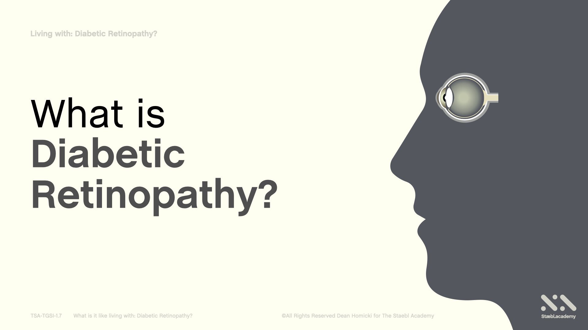 Orientation in a built environment if you had: Diabetic Retinopathy In this simulation of what it might be like if you had Diabetic-retinopathy, we are walking, descending a staircase, then negotiating a pedestrian crossing.