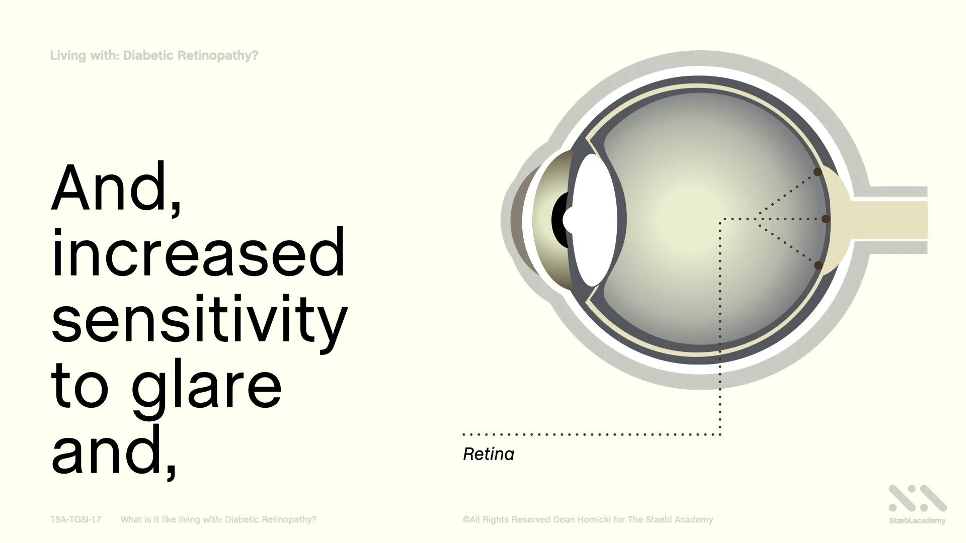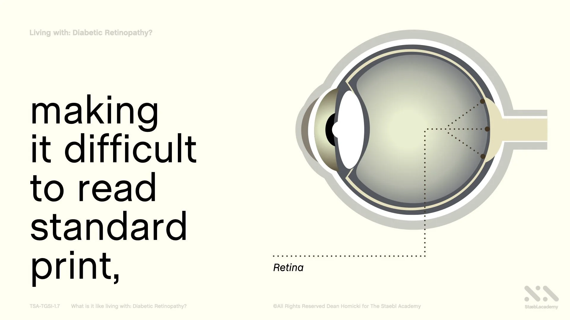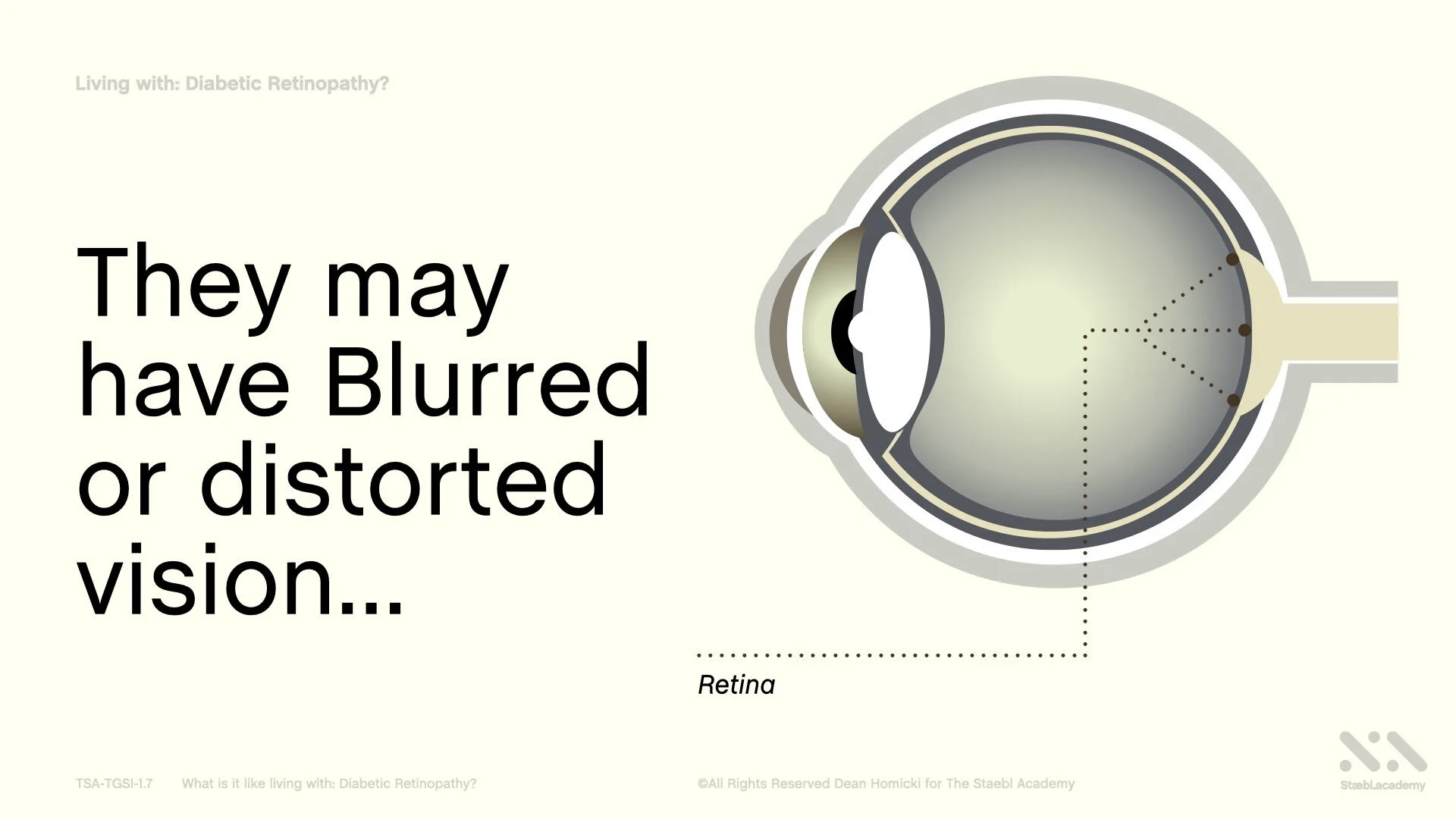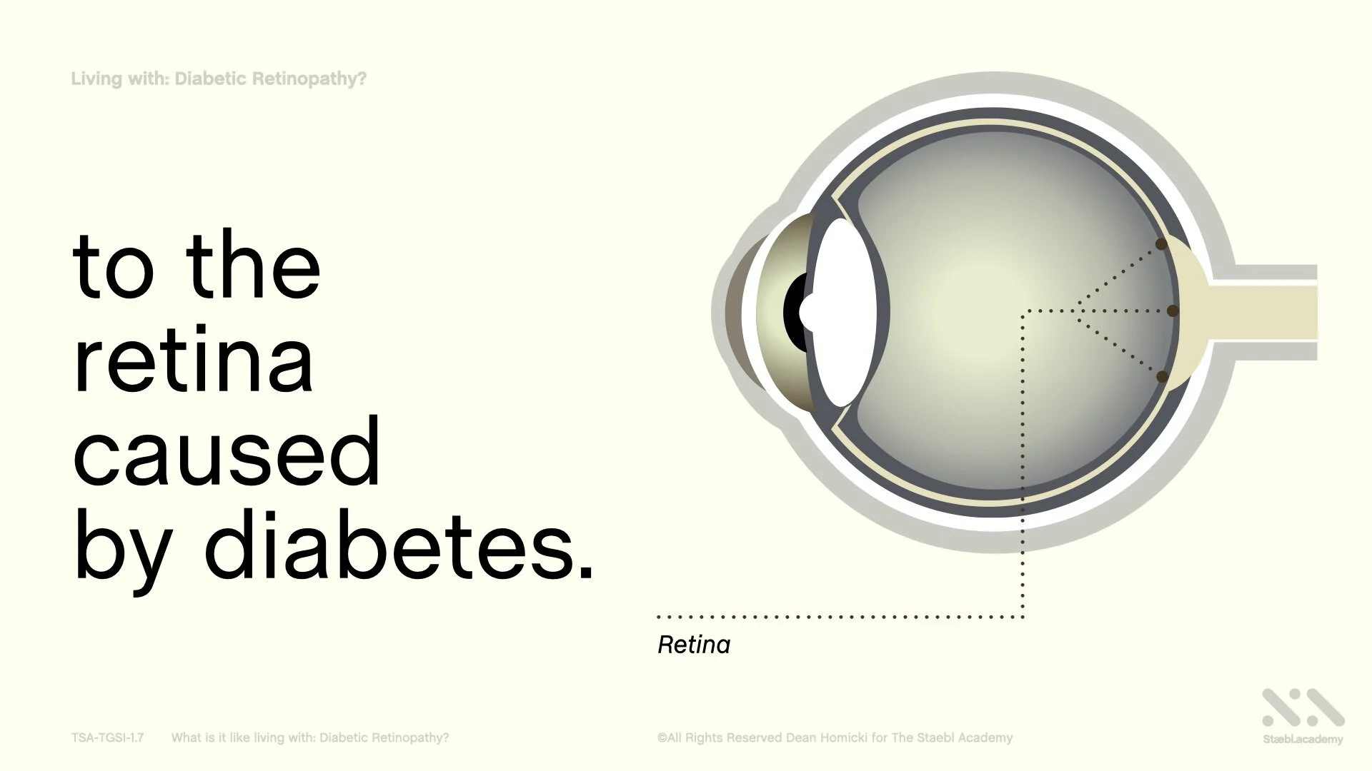 Orientation in a built environment if you had: Diabetic Retinopathy In this simulation of what it might be like if you had Diabetic-retinopathy, we are walking, descending a staircase, then negotiating a pedestrian crossing.