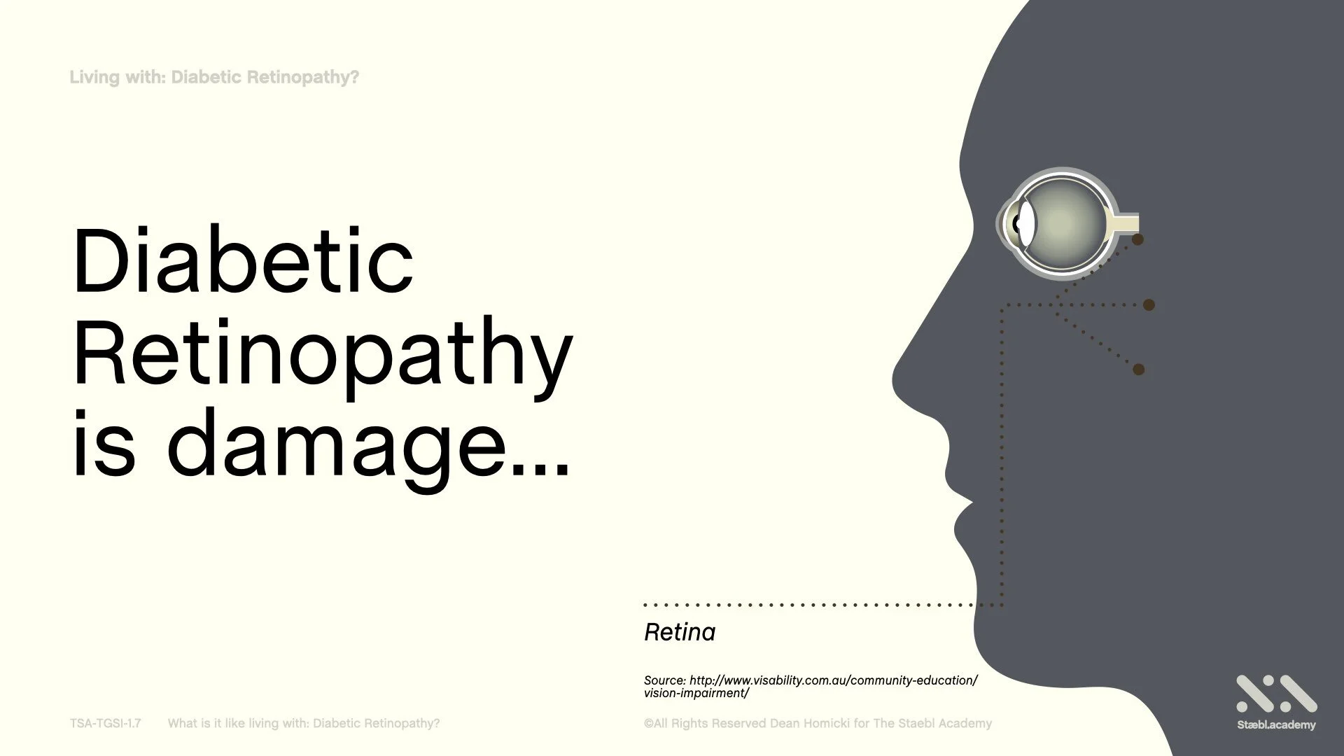 In this module, we explore what a vision-impaired person may experience living with Diabetic Retinopathy and how the built environment may appear to them in their daily life. To gain some insight, let's begin with: