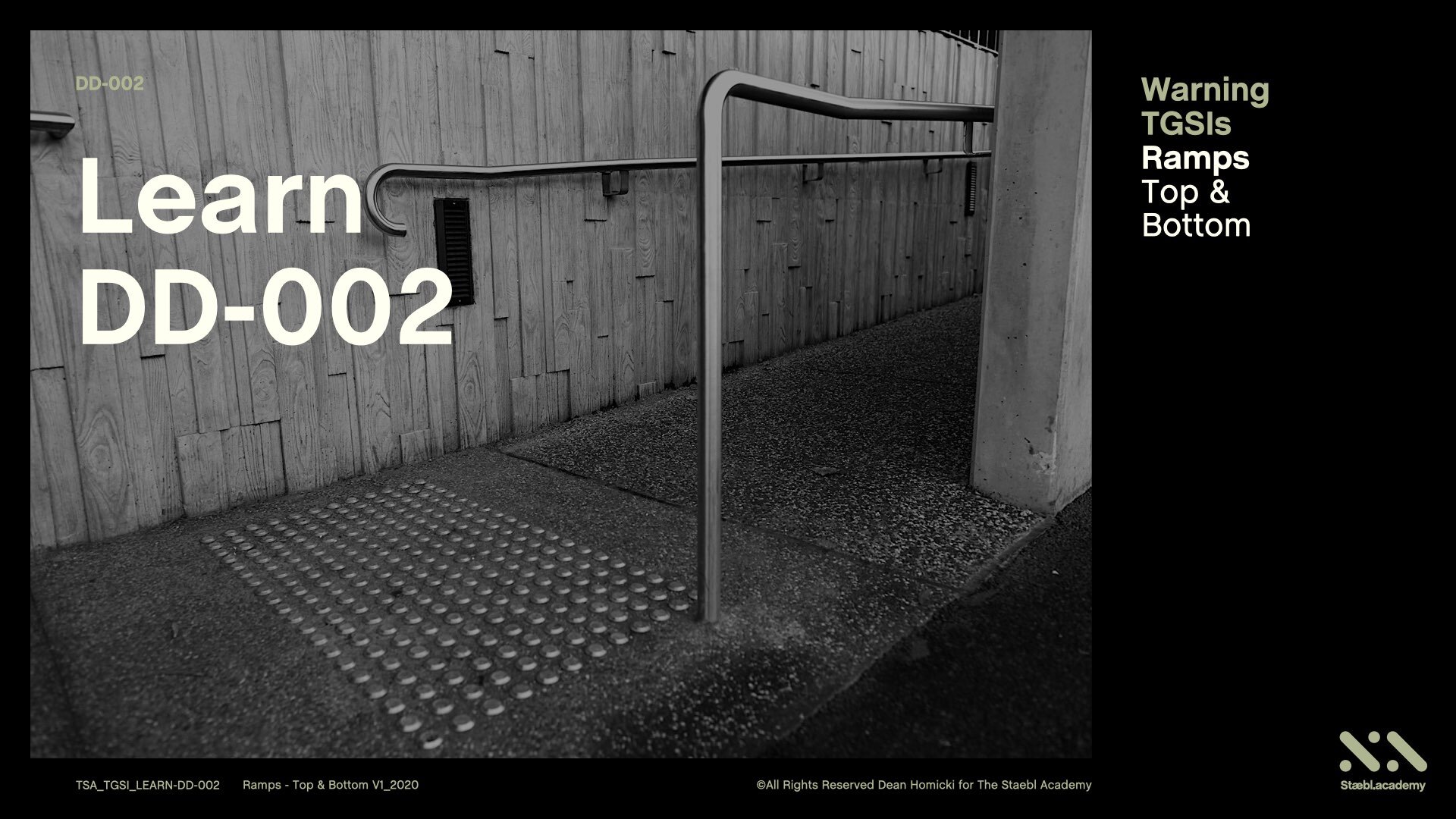 This Staebl.academy learning session will cover the use of Warning TGSIs on Ramps at the Top and Bottom. For the orientation of persons who are blind or vision-impaired, applying this knowledge enables us to determine how to use TGSIs and conform to the Normative and Informative Guidelines of the Australian TGSI standards.