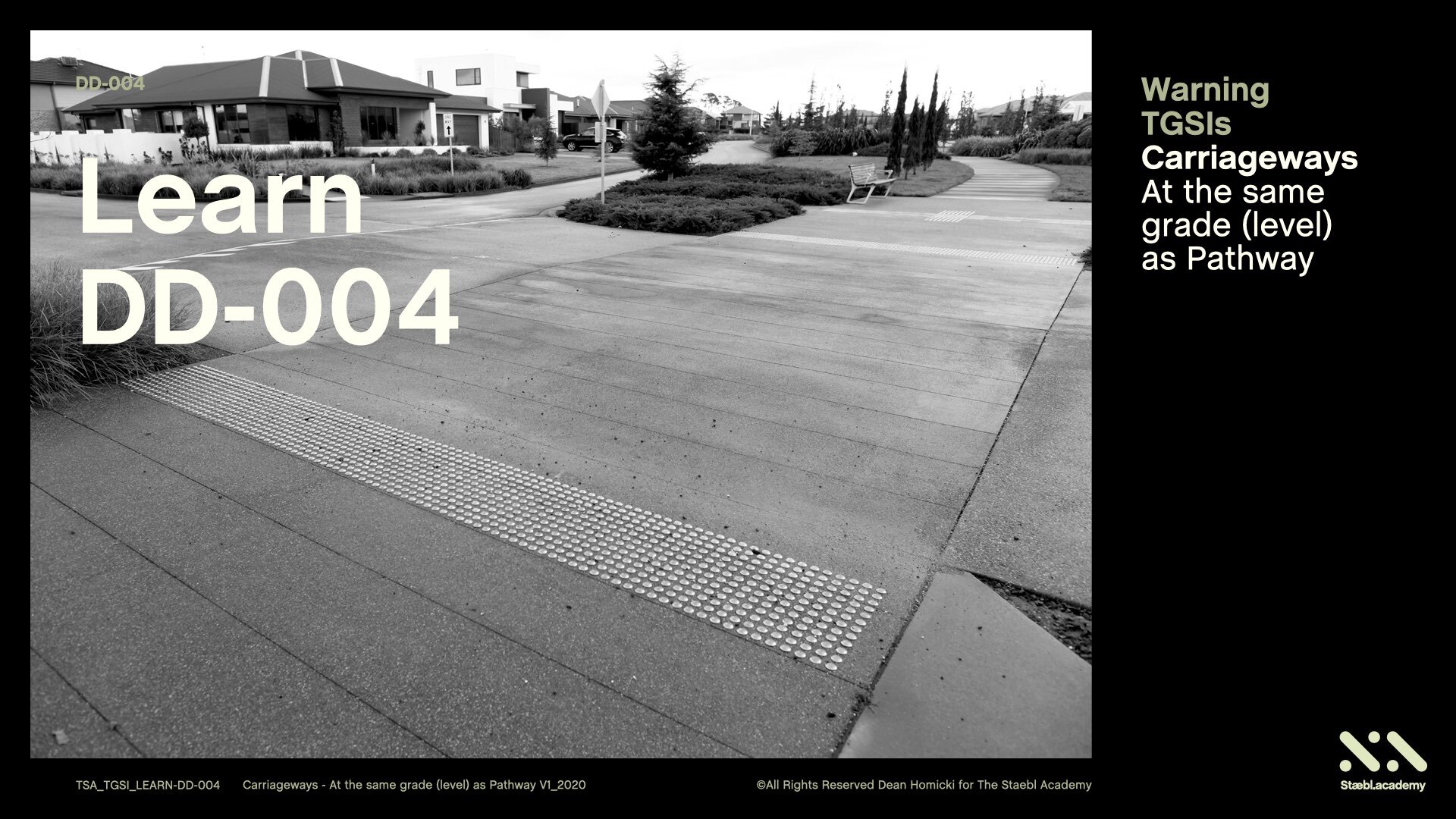 This Staebl.academy learning session will cover the use of Warning TGSIs on a Pedestrian Crossing which is at the same grade (or level) as the Carriageway. For the orientation of persons who are blind or vision impaired, applying this knowledge enables us to determine how to use TGSIs and conform to the specifications of the Australian TGSI standards.
