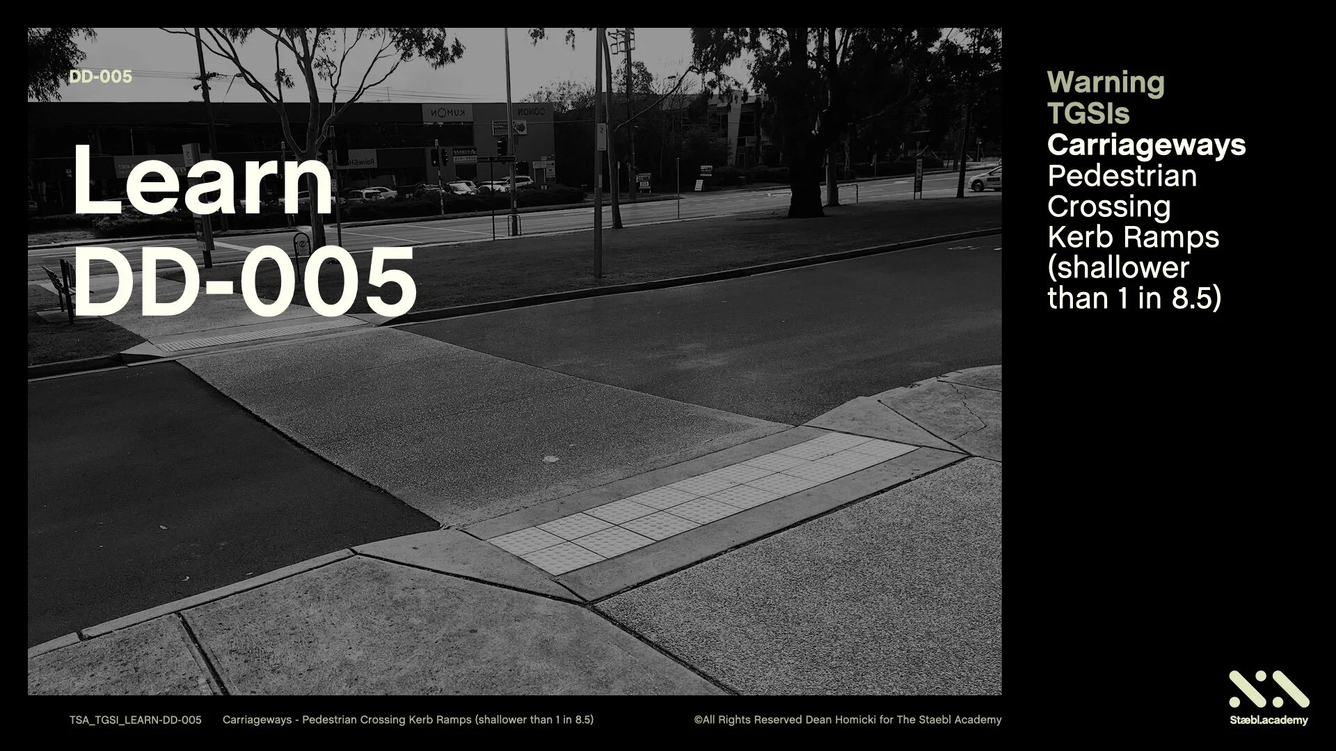 This Staebl.academy learning session will cover the use of Warning TGSIs on Kerb Ramps on a Carriageway Pedestrian Crossing, which are (shallower than 1 in 8.5). For the orientation of persons who are blind or vision impaired, applying this knowledge enables us to determine how to use TGSIs and conform to the specifications of the Australian TGSI standards.