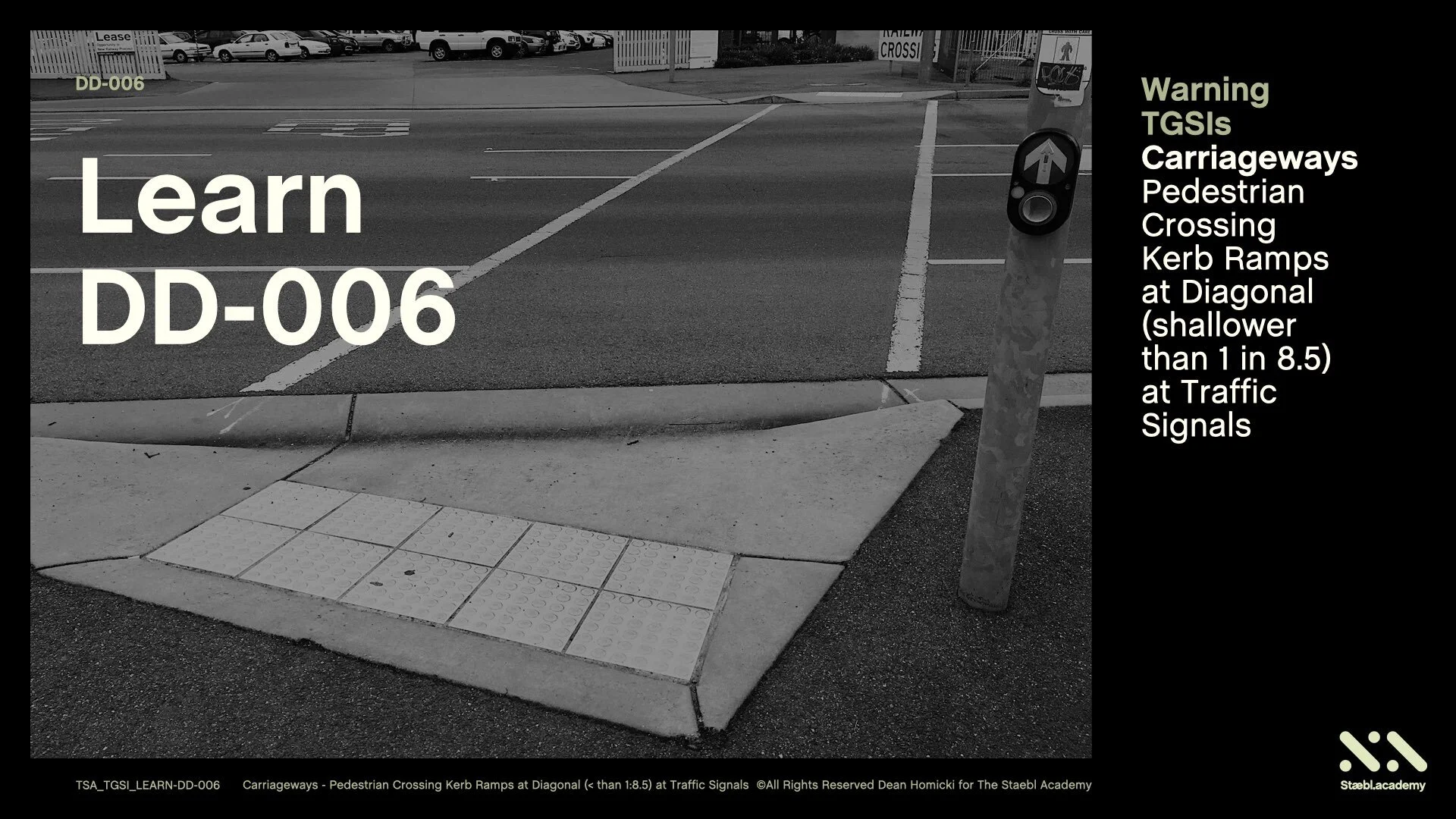 This Staebl.academy learning session will cover the use of Warning TGSIs on Carriageway Pedestrian Crossing Kerb Ramps, at a diagonal, that are (shallower than 1 in 8.5), at Traffic Signals. For the orientation of persons who are blind or vision impaired, applying this knowledge enables us to determine how to use TGSIs and conform to the specifications of the Australian TGSI standards.