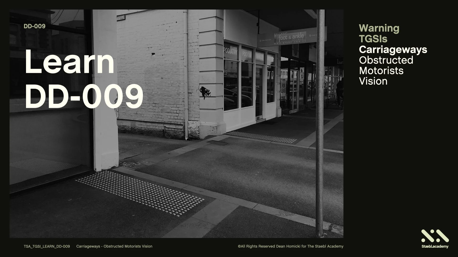 This Staebl.academy learning session will cover the use of Warning TGSIs on Carriageways, where and when a Motorists Vision is obstructed. For the orientation of persons who are blind or vision impaired, applying this knowledge enables us to determine how to use TGSIs and conform to the specifications of the Australian TGSI standards.