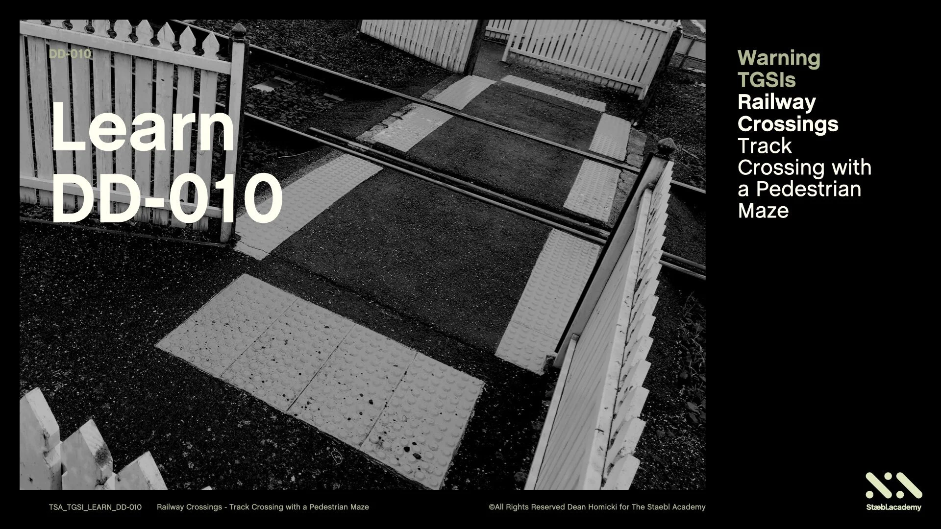 This Staebl.academy learning session will cover the use of Warning TGSIs on a Railway Crossing - A Track Crossing with a Pedestrian Maze. For the orientation of persons who are blind or vision impaired, applying this knowledge enables us to determine how to use TGSIs and conform to the specifications of the Australian TGSI standards.
