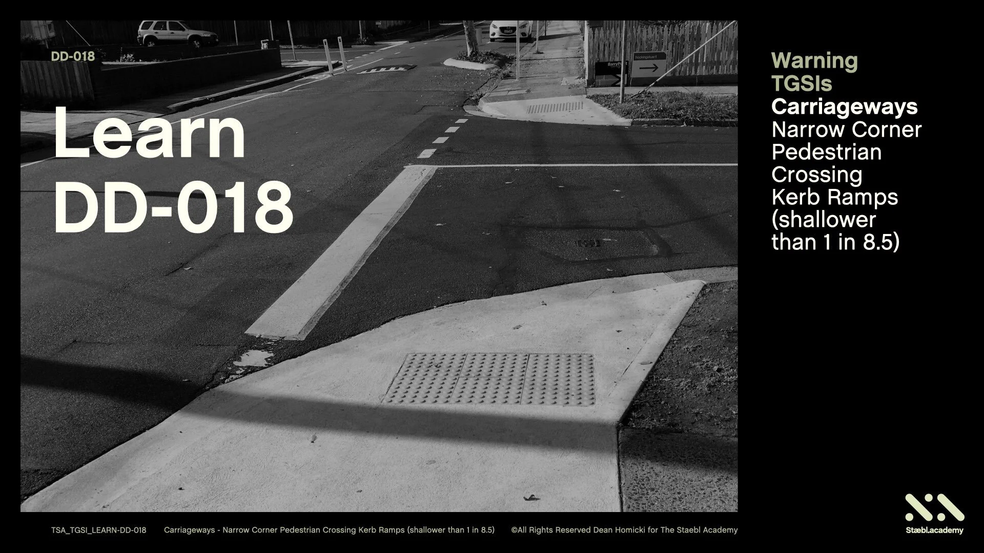 This Staebl.academy learning session will cover the use of Warning TGSIs on a Carriageway Narrow Corner, with a Pedestrian Crossing with Kerb Ramps that are (shallower than 1 in 8.5). For the orientation of persons who are blind or vision impaired, applying this knowledge enables us to determine how to use TGSIs and conform to the specifications of the Australian TGSI standards.