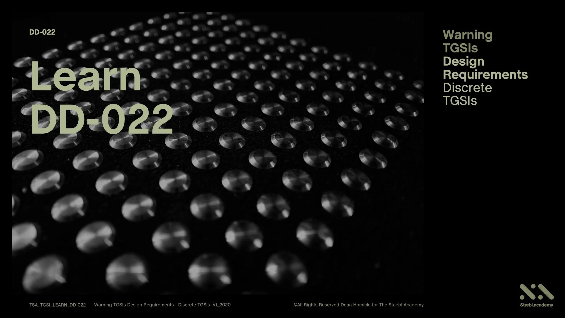 In this learning session, we review the Australian Discrete Warning Tactile Ground Surface Indicators (TGSIs). Discrete TGSIs are defined as 'Tactile Ground Surface Indicators (TGSIs) that are individually installed, which provide the same Luminance for the Sloping Sides, and the Upper Surface of the Truncated Cone.' Your Instructor Dean Homicki will guide you through the many design requirements of this TGSI product type as they relate to the various Australian Standards that govern their dimensionality and essential performance criteria.