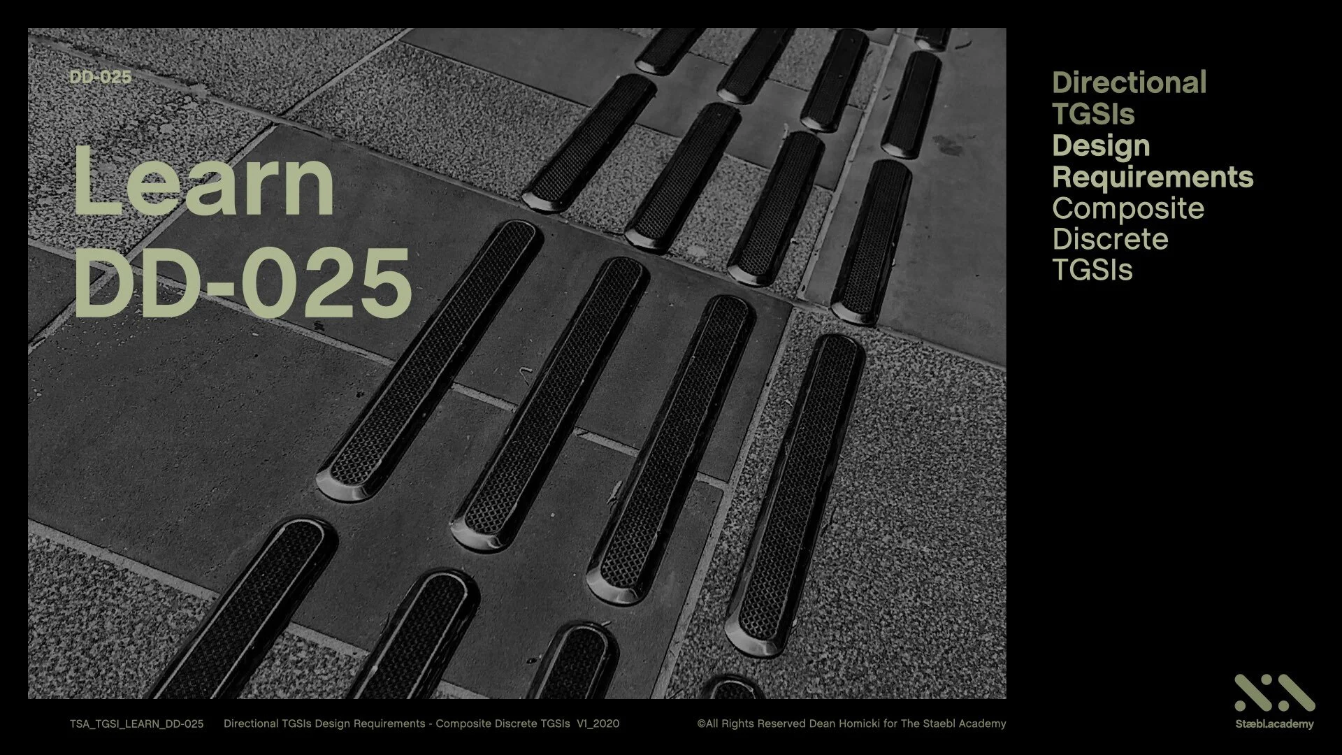 In this learning session, we review the Australian Composite Discrete Directional Tactile Ground Surface Indicators (TGSIs). Composite Discrete TGSIs are defined as 'TGSI that are individually installed, which provide a differing luminance for the sloping sides, and the upper surface of the truncated Bar.' Your Instructor Dean Homicki will guide you through the many design requirements of this TGSI product type as they relate to the various Australian Standards that govern their dimensionality and essential performance criteria.