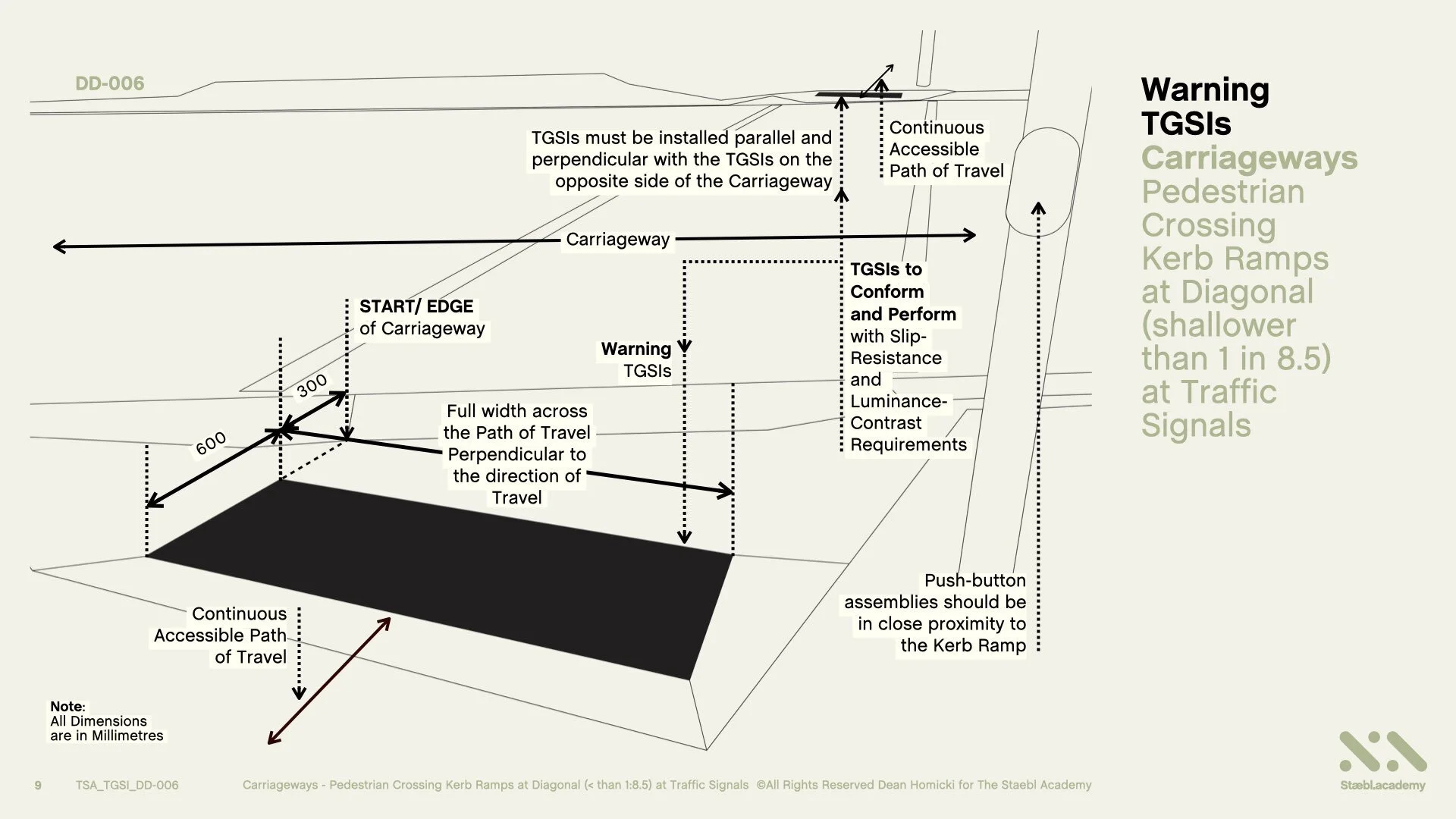 Warning TGSIs Shall be set back 300 mm with a tolerance of +/- 10 mm from the start/edge of the Carriageway, or from the nearest point of the start of the incline, with or without a physical kerb, gutter or barrier, to a minimum depth of 600 mm, for the full width across the Path of Travel, and must be perpendicular to the direction of travel.