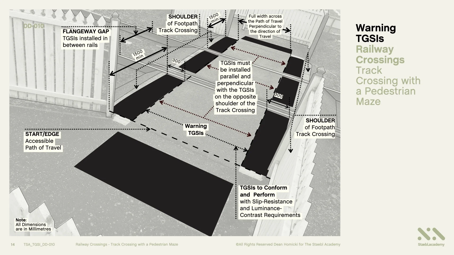 TGSIs must also be (installed) parallel and perpendicular with the TGSIs on the opposite shoulder of the Pedestrian Railway Track Crossing providing for persons who are blind or vision-impaired with safe orientation and travel.