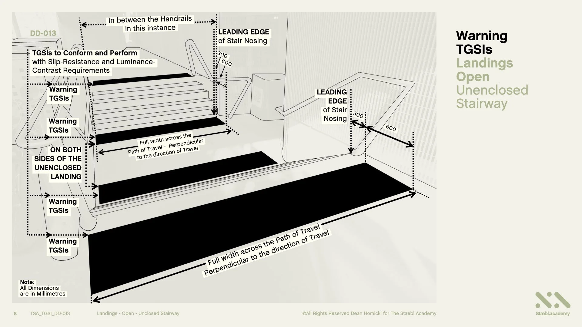 When a Stairway, Ramp, Escalator or Moving Walkway, leads to an UNENCLOSED area at the top or the bottom, Warning TGSIs Shall be, set back 300 mm with a tolerance of +/- 10 mm, from the outer leading edge of the Stair Nosing to a minimum depth of 600 mm, for the full width across the Path of Travel, and, must be perpendicular to the direction of travel.