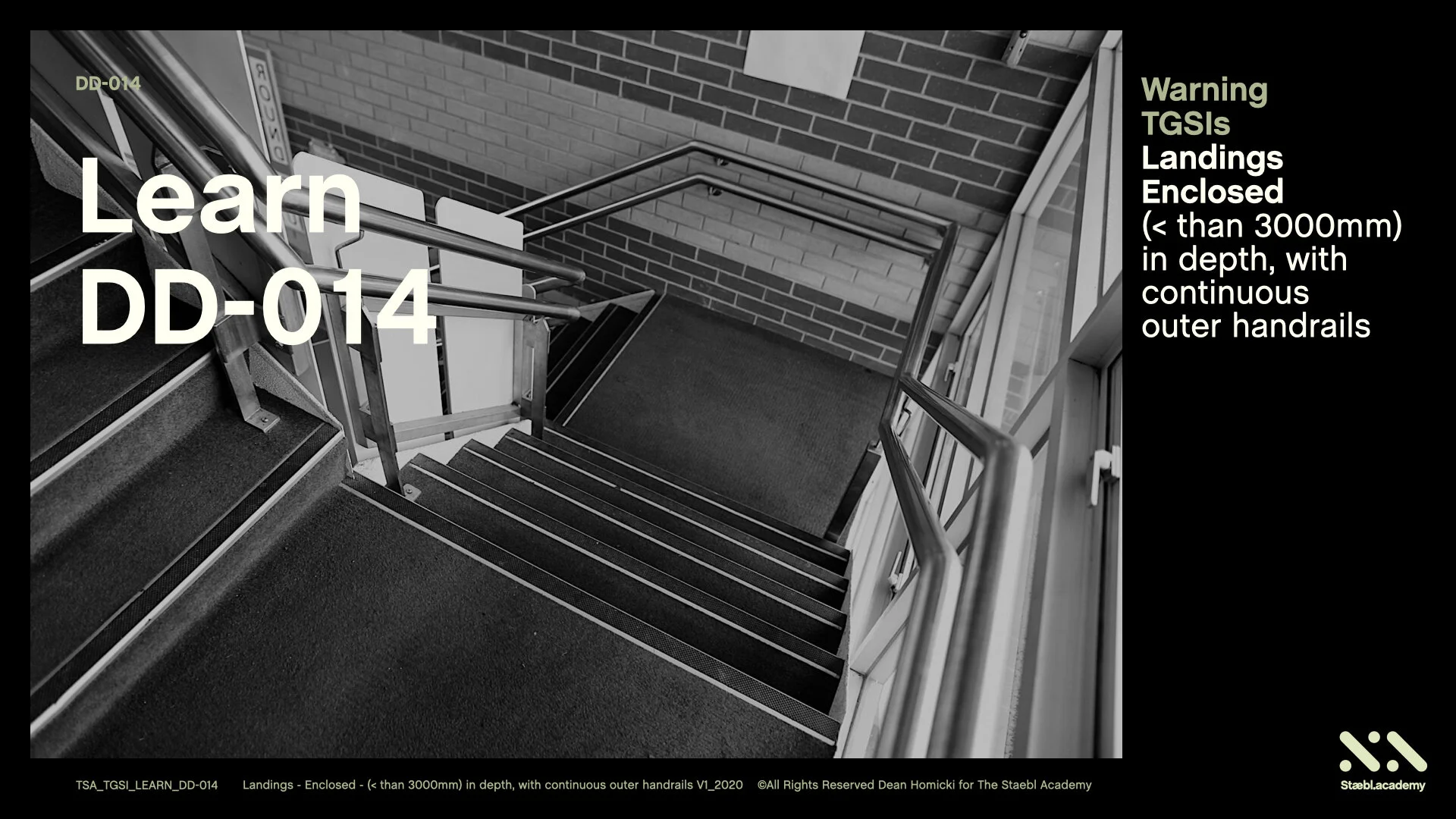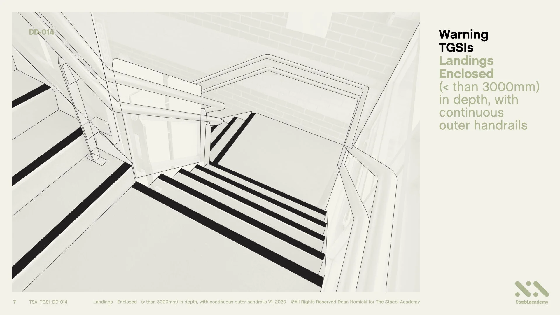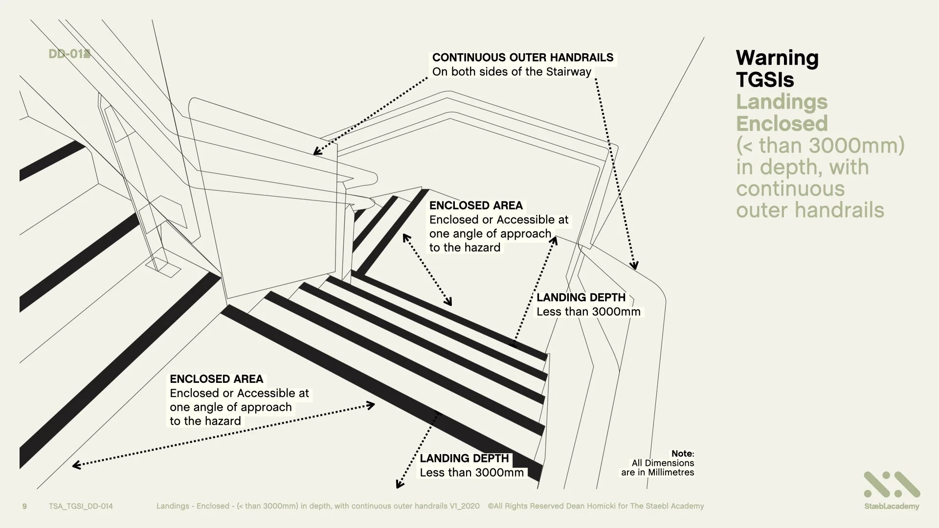 That’s the conclusion for Warning TGSIs, on a Stairway with enclosed Landings, less than 3000 mm in depth, with continuous outer handrails.