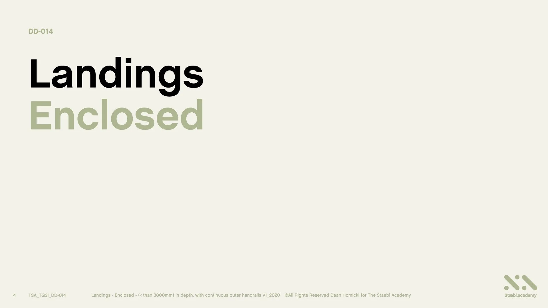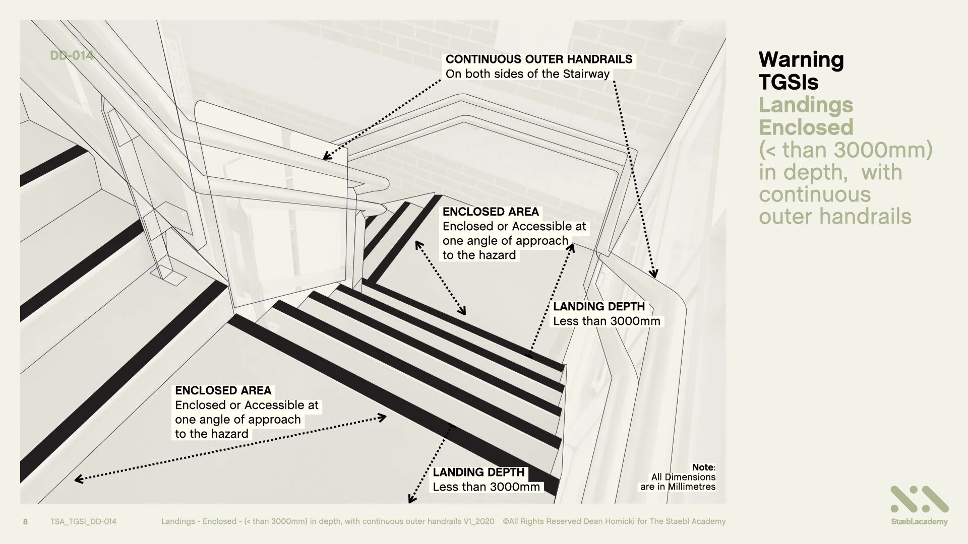 When a Stairway or Ramp, has one or more ENCLOSED landings, Less than 3000 mm in depth, with Continuous outer handrails, Warning TGSIs are not required on Enclosed Landings.