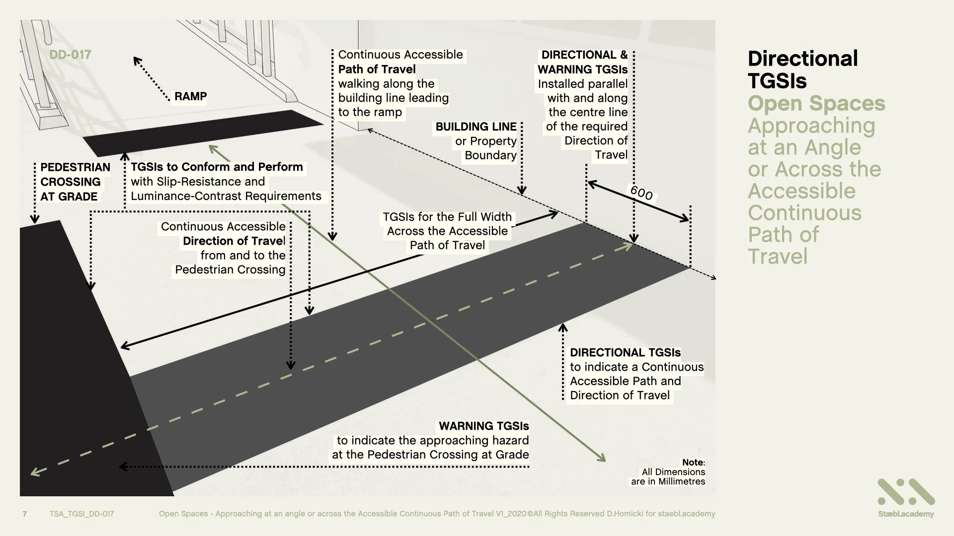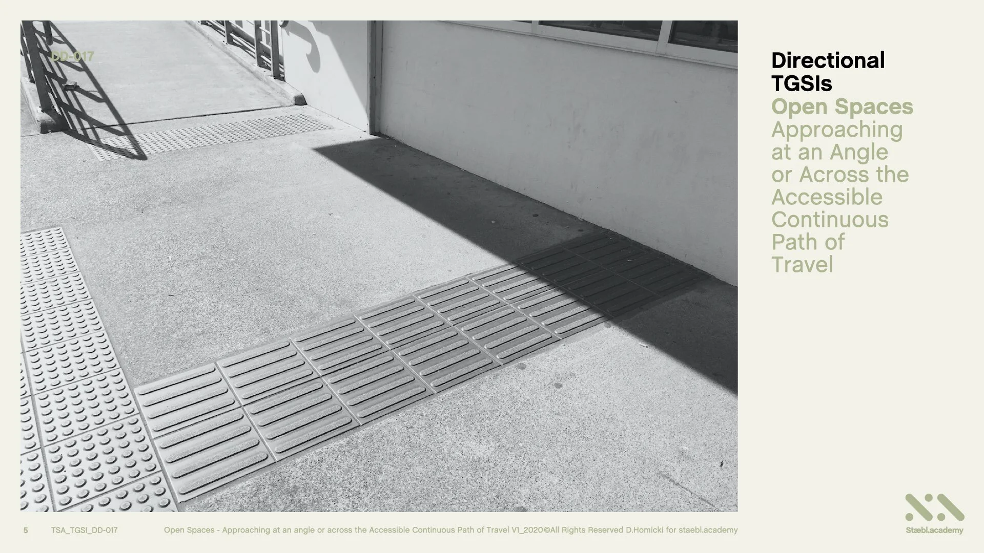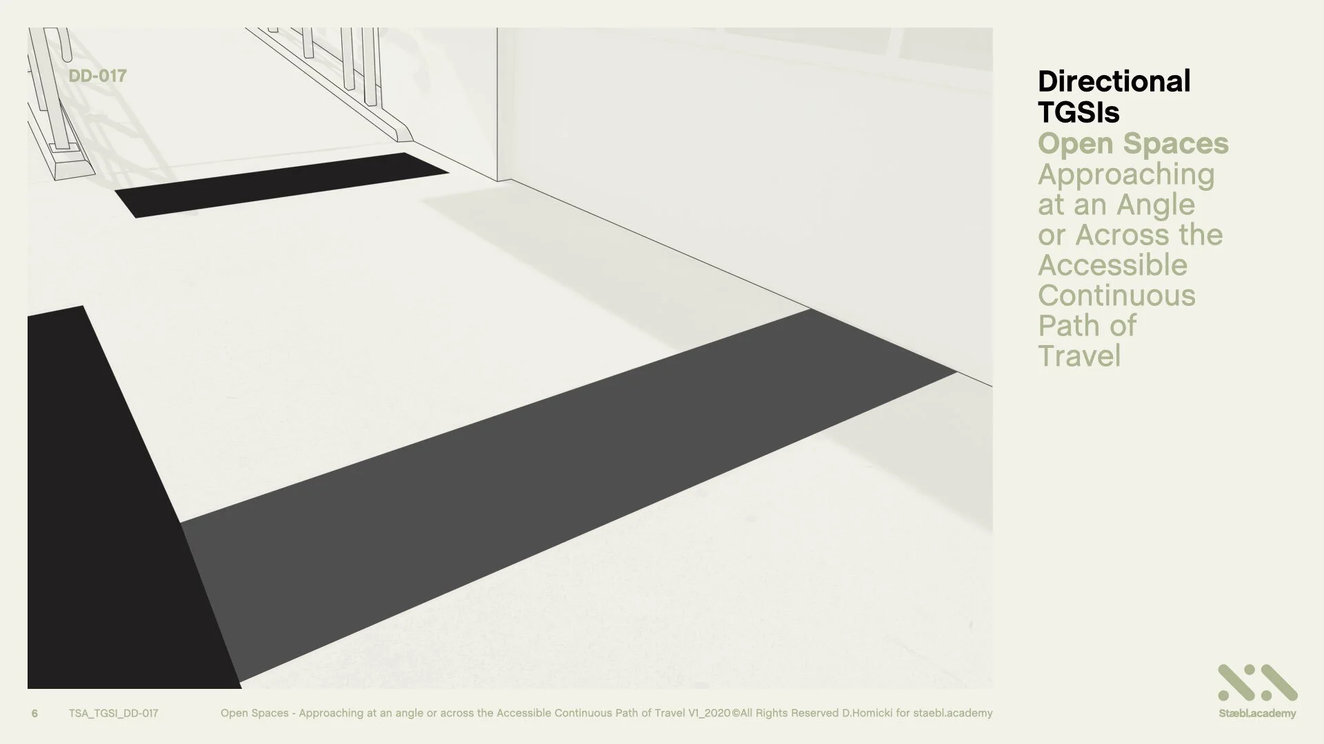 That’s the conclusion for Directional TGSIs in Open Spaces, Directional and Warning TGSIs in Open Spaces Approaching at an Angle, or across the Accessible Continuous Path of Travel.