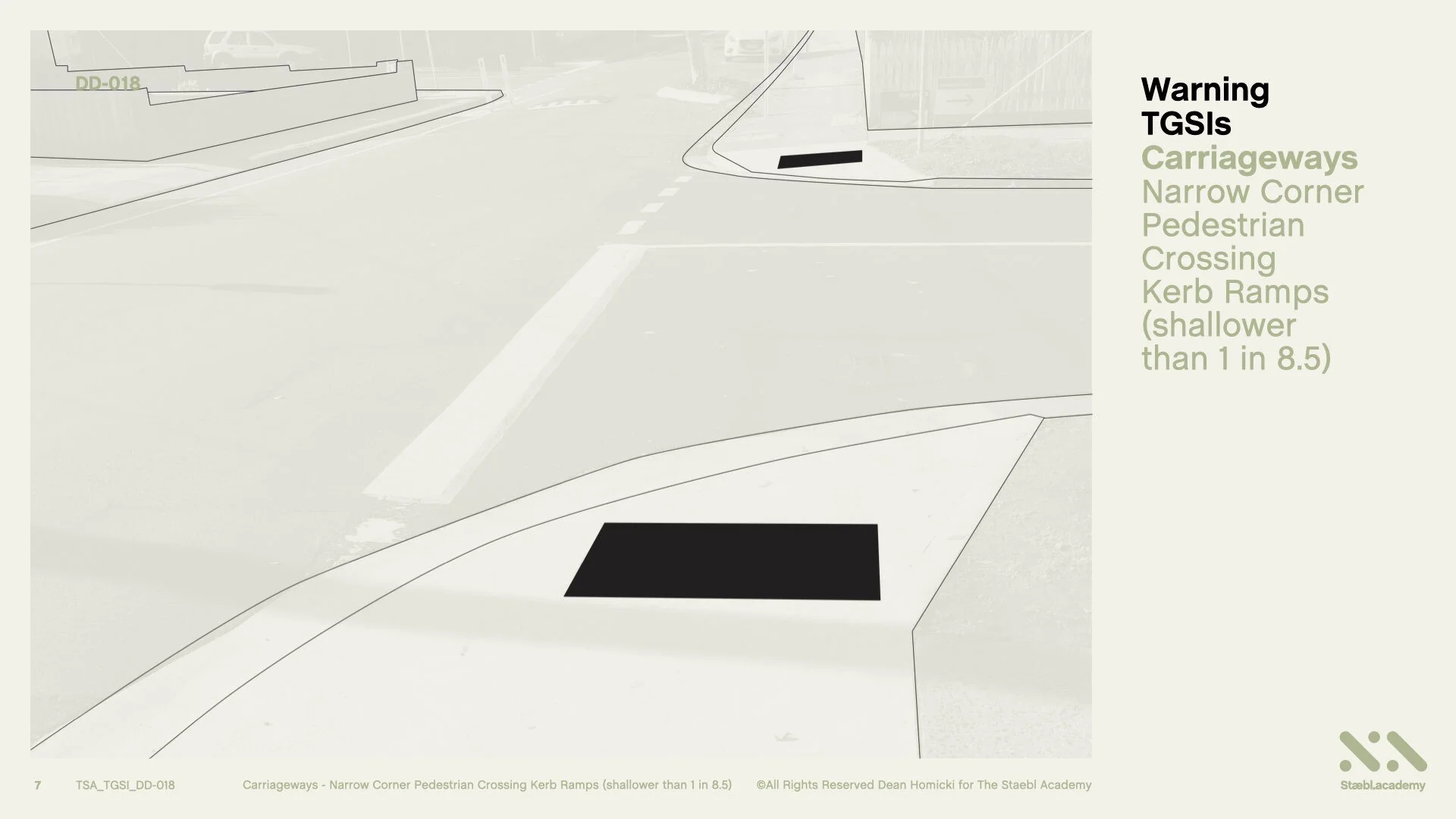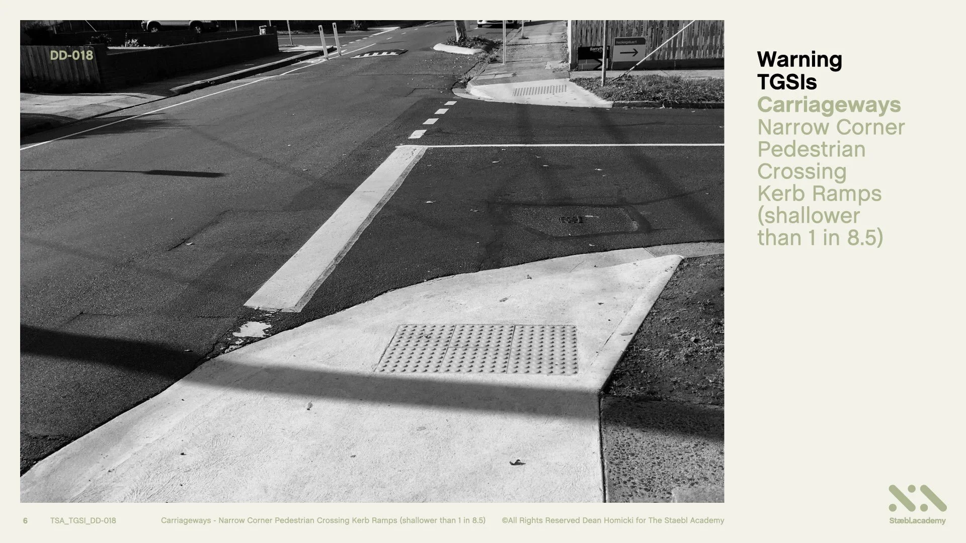 Let’s review one type of Pedestrian Crossing Kerb Ramp, a Kerb Ramp that is, (Shallower than 1 in 8.5), with a vehicle Carriageway, and together extract what the Australian TGSI Standard requires of the situation.