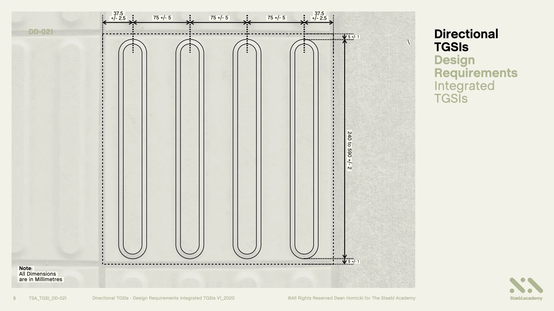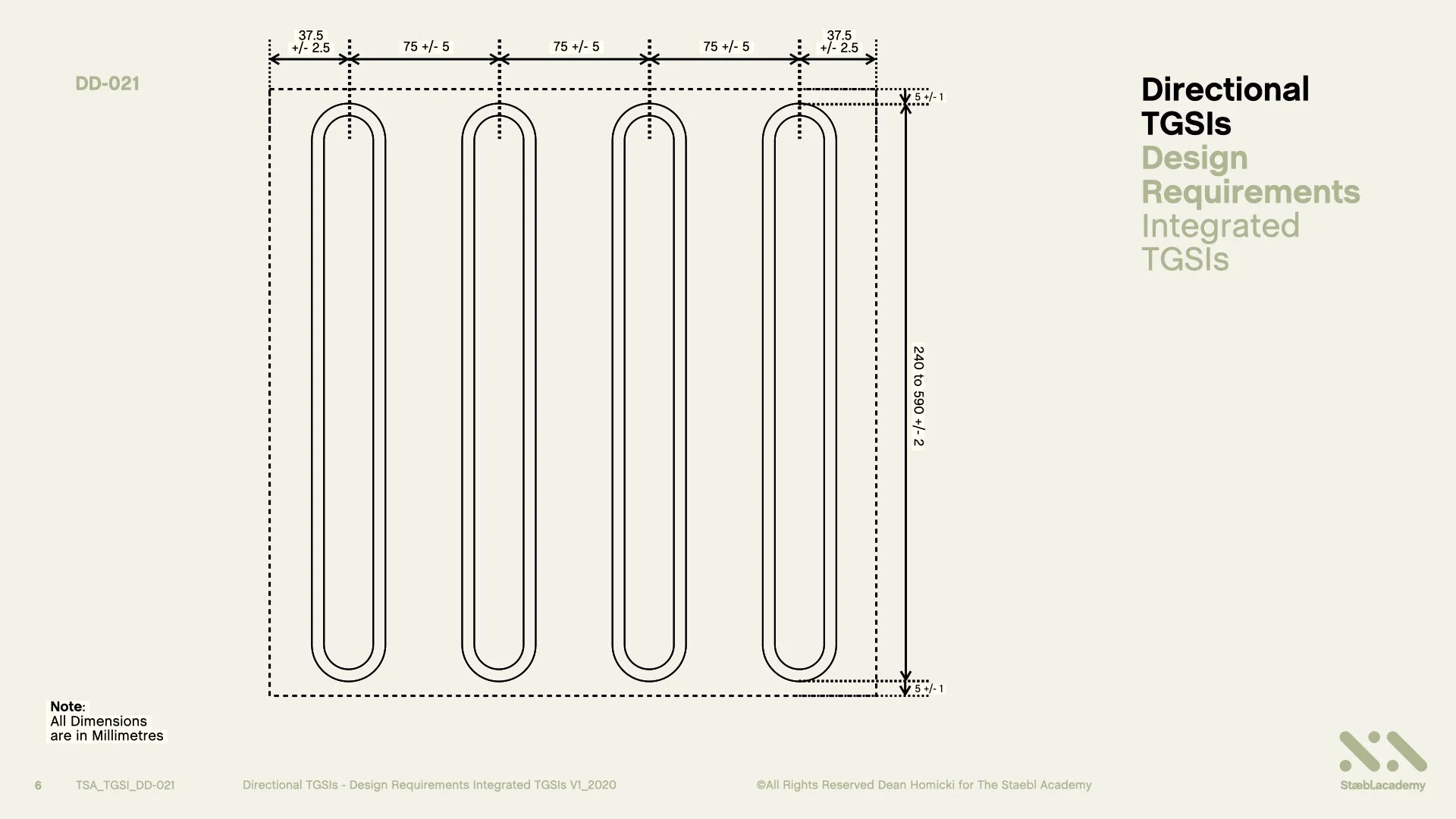 When Integrated Directional TGSIs modules are installed together, (side-by-side), it is important that the 75 +/- 5 mm spacing between each Truncated Bars is maintained. This means that from the outer edge of the Integrated Directional TGSI module to the centre of the Upper Surface of the Truncated Bar, the spacings will be 37.5 +/- 2.5 mm. The length of the Truncated Bar at its Base Surface shall be between 240 to 590 +/- 2 mm.