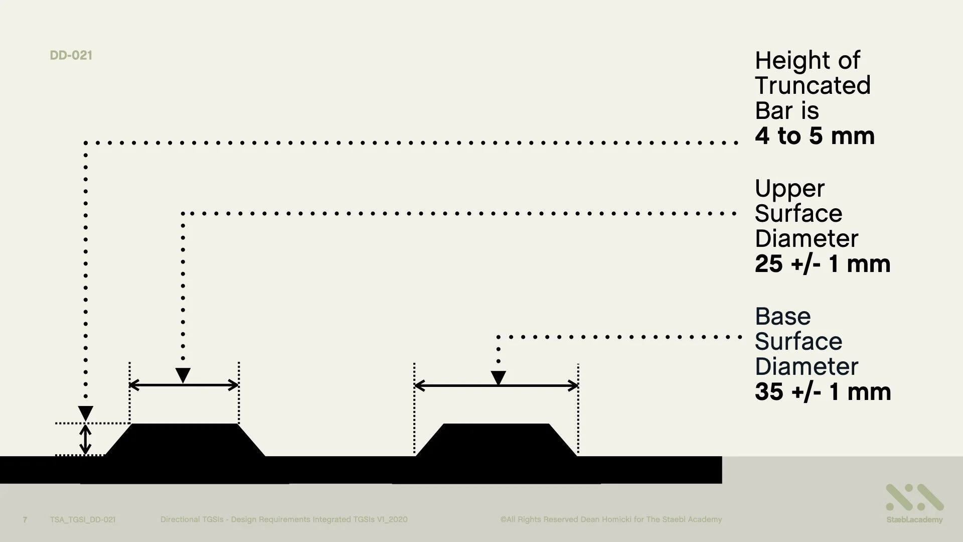 In an Elevation View of the Integrated Directional TGSIs, we can see that, the Height of each Truncated Bar is 4 to 5 mm, that the Upper Surface Diameter of is 25 +/- 1 mm, and that the Base Surface Diameter 35 +/- 1 mm.